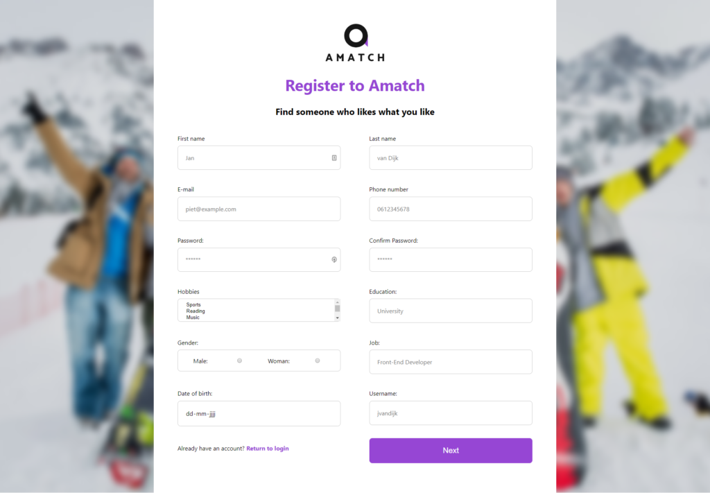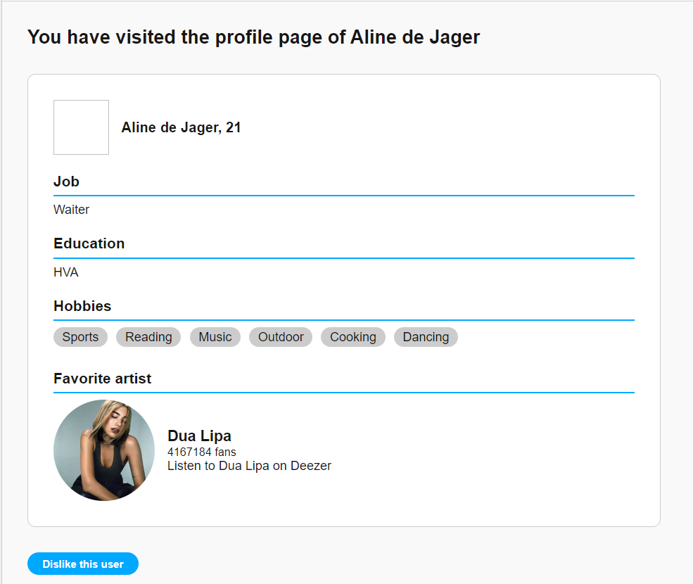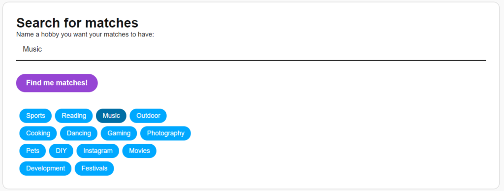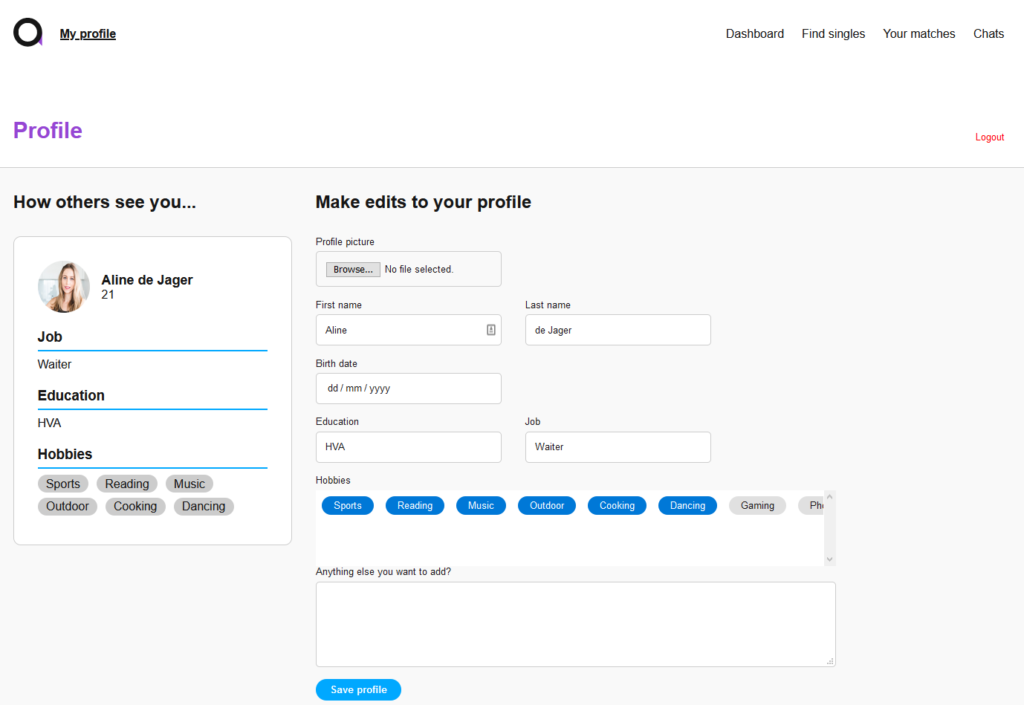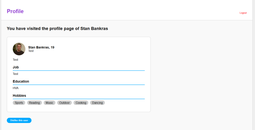 Mijn individuele feature was het kunnen matchen op gelijke hobby’s of interesses. Dat maakt het vinden naar personen die je leuk vind een stuk makkelijker.