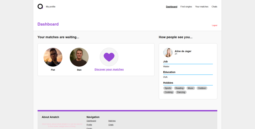 Samen met twee andere studenten hebben ik een we een fictieve dating site gebouwd. Het begon afzonderlijk en was het bedoeling dat ieder eerst een deel van een dating site zou bouwen om dat later samen te voegen.