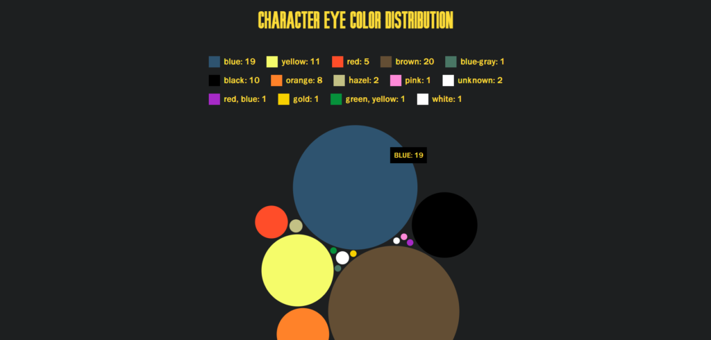Op de visualisatie pagina heb ik met D3 een force layout visualisatie gemaakt op basis van data over de oogkleuren. Met wat code kon ik een nieuw array maken met alle oogkleuren van alle karakters bij elkaar opgeteld. De grootte van een cirkel laat zien hoe vaak een oogkleur voor komt. En met de legenda en de hover tool tip is af te lezen welk aantal het gaat.