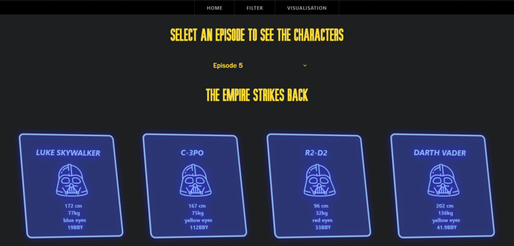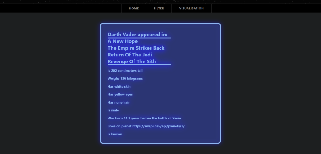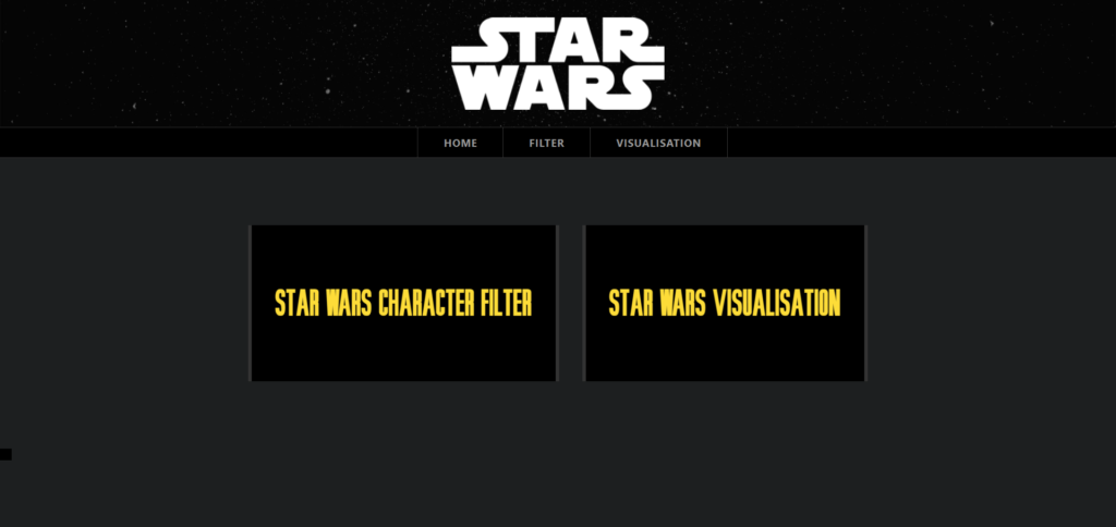 Omdat andere studenten hiervoor al een D3 visualisatie hadden gemaakt moest ik voor dit vak iets nieuws verzinnen. Maar omdat ik voor de Minor Web Design & Development al de Star Wars API gebruikt had besloot ik dat concept te vertalen in een React App. De styling kon ik hergebruiken maar ik heb het wel omgezet naar SASS.